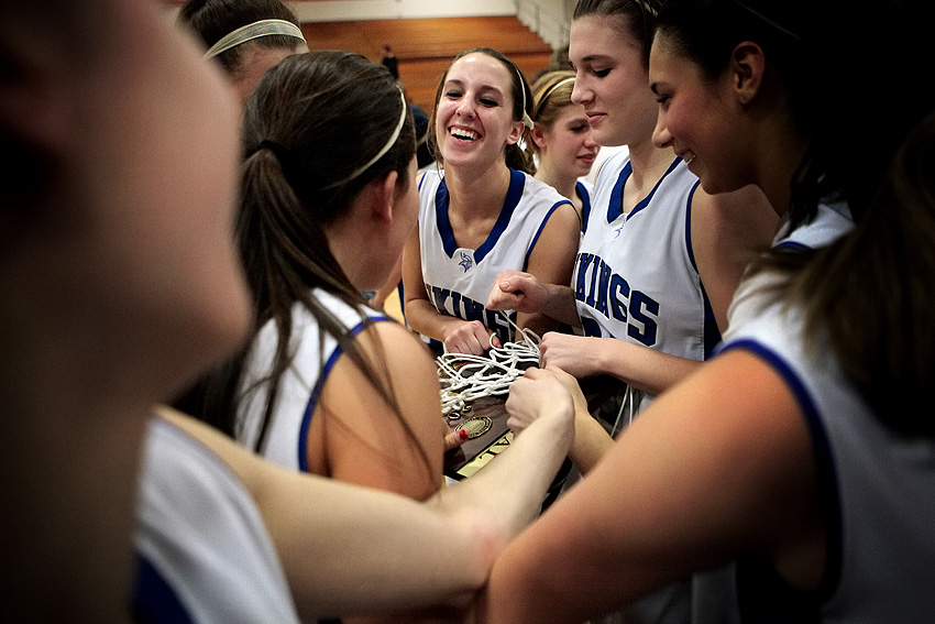 Geneva's Kelsey Pease, center, and teammates huddle around their regional championship plaque after their Class 4A regional championship win at St. Charles East High School in St. Charles, Ill., on Thursday, February 17, 2011. | Andrew A. Nelles~For Sun-Times Media